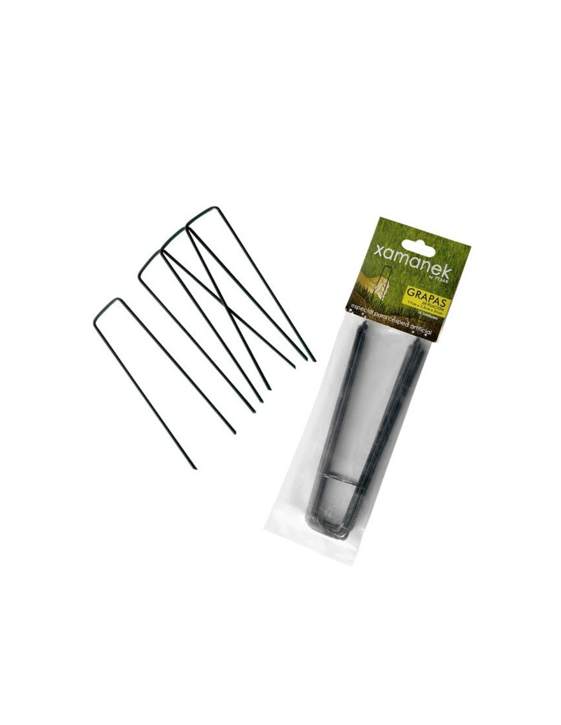 Artificial grass staples or nails are ideal for ensuring a firm and secure installation on any type of ground. Measuring 17 cm in length, 3.5 cm in width, and 3 mm in thickness, these staples are designed to provide stability and strength. Price per pack of 10 staples.