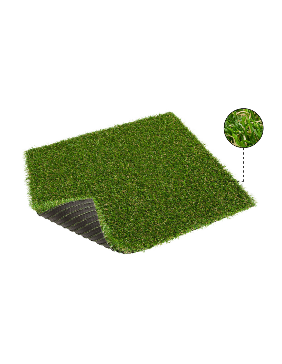 El césped artificial 18 mm de espesor se produce en rollos de 2 y 4 metros de ancho, con posibilidad de corte para pedido mínimo de 11 m2. Este césped artificial ofrece una combinación ideal de suavidad y resistencia gracias a su composición de 55% PE y 45% PP. Con una densidad de 24.150 puntadas/m2 y respaldado por una garantía de 600 KLY, garantiza una apariencia natural y duradera durante años.